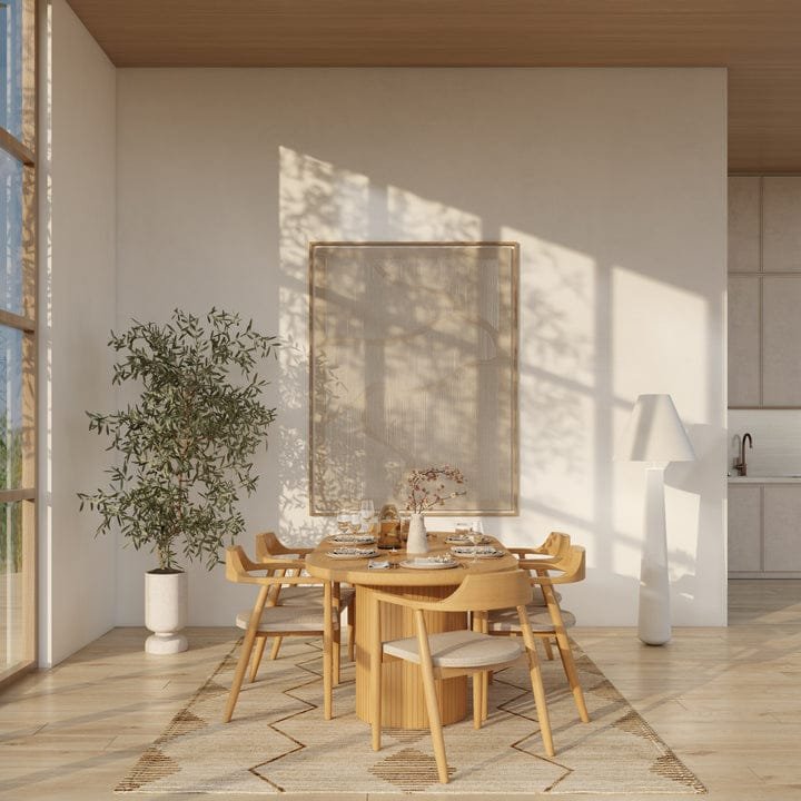 A bohemian dining set with a natural feel, a simple design based on natural wood, adding a sense of warmth and comfort to the dining area.