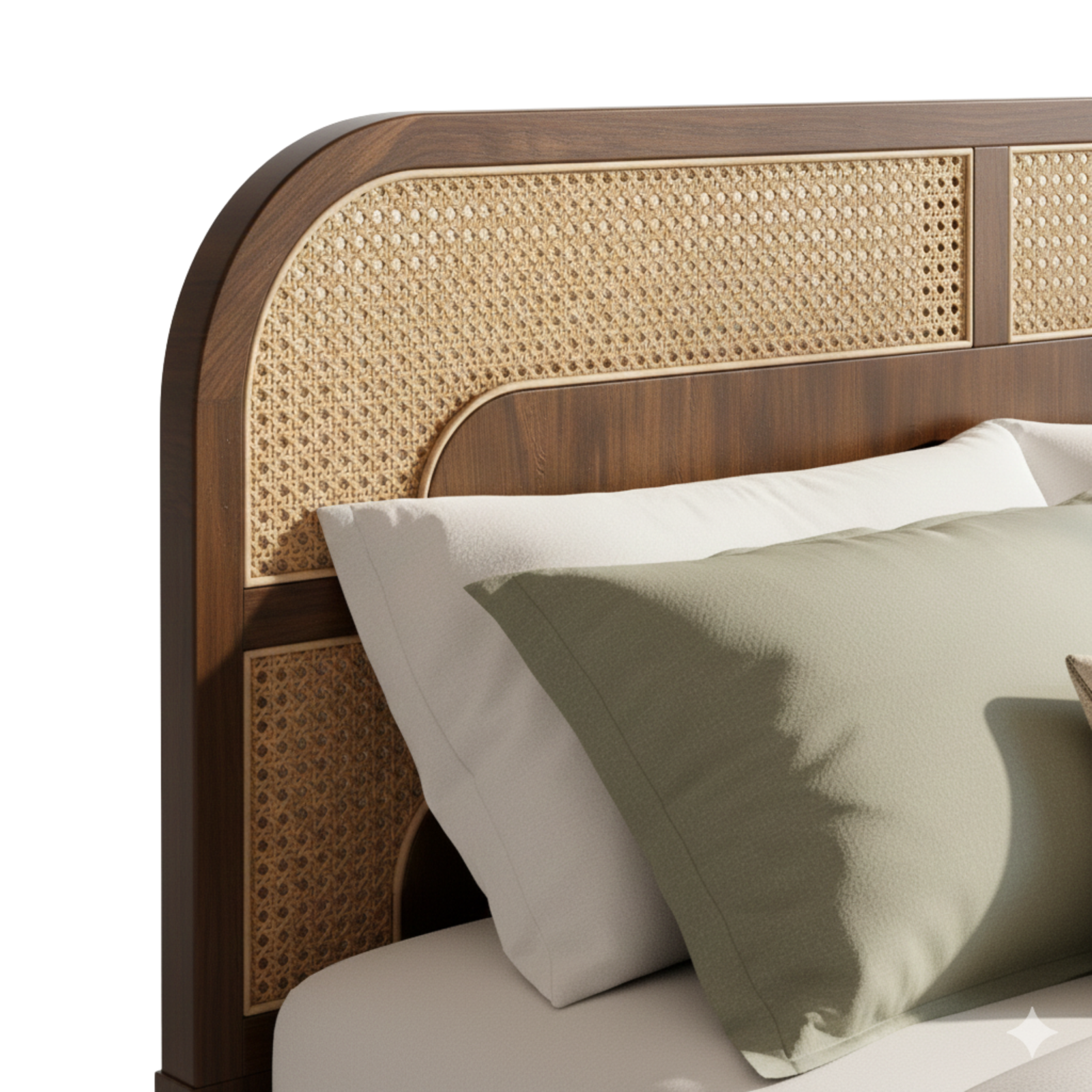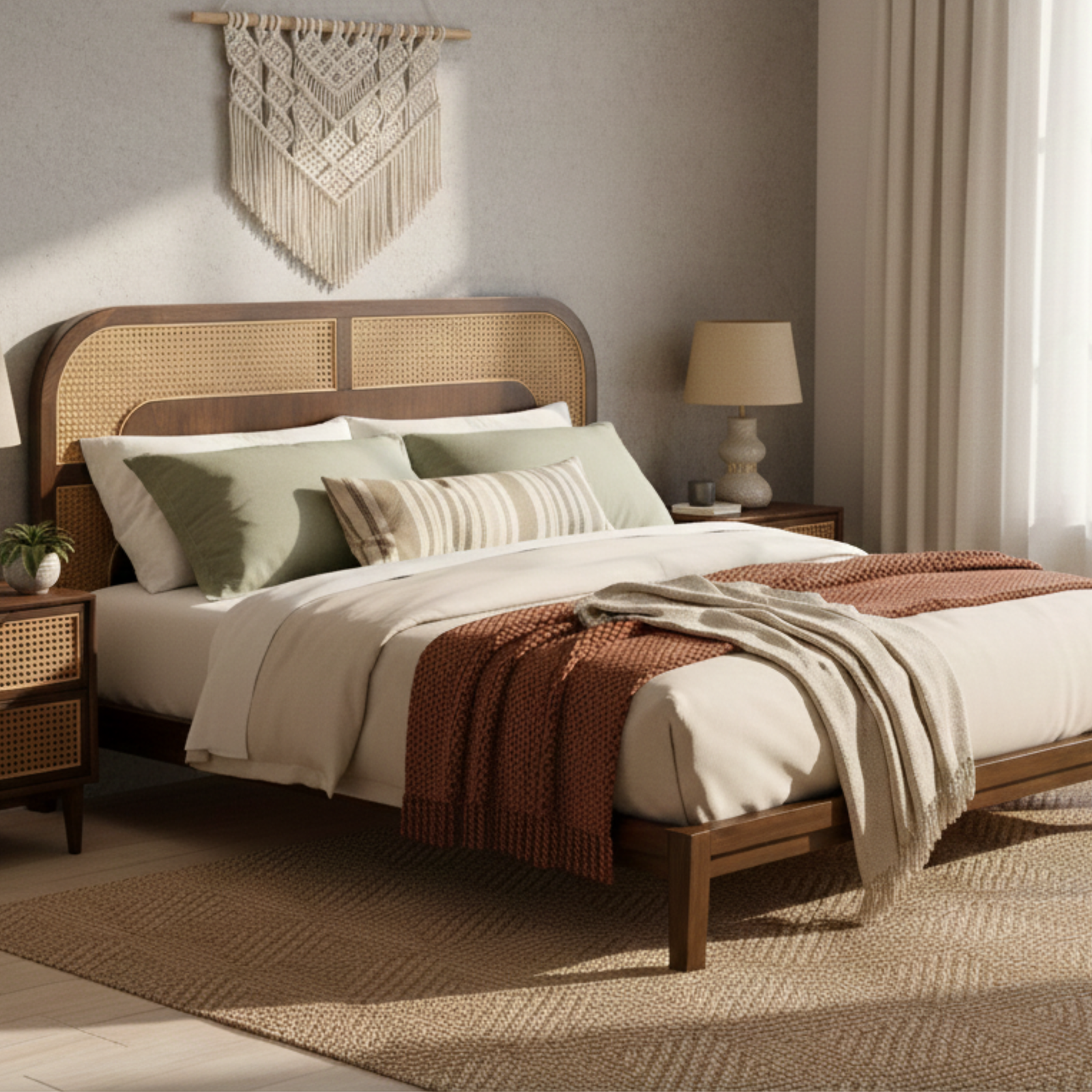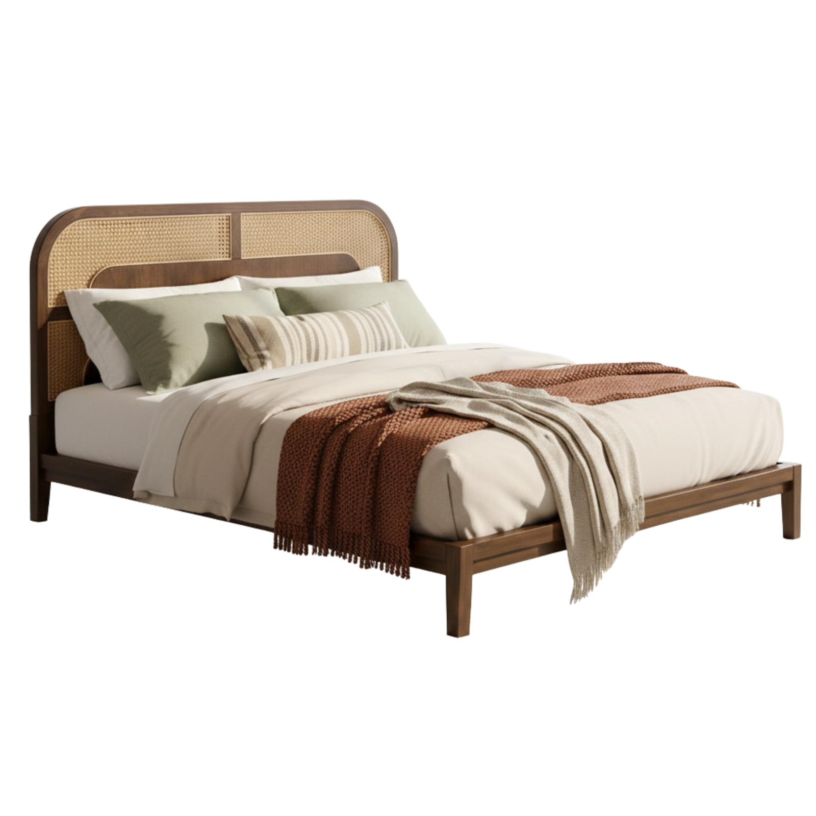 DIWAN Bed is a refined Boho cane bed crafted from solid beech wood, designed to bring natural warmth and understated luxury to modern bedrooms. Featuring a handwoven natural cane headboard, it blends organic texture with clean lines and timeless craftsmanship.