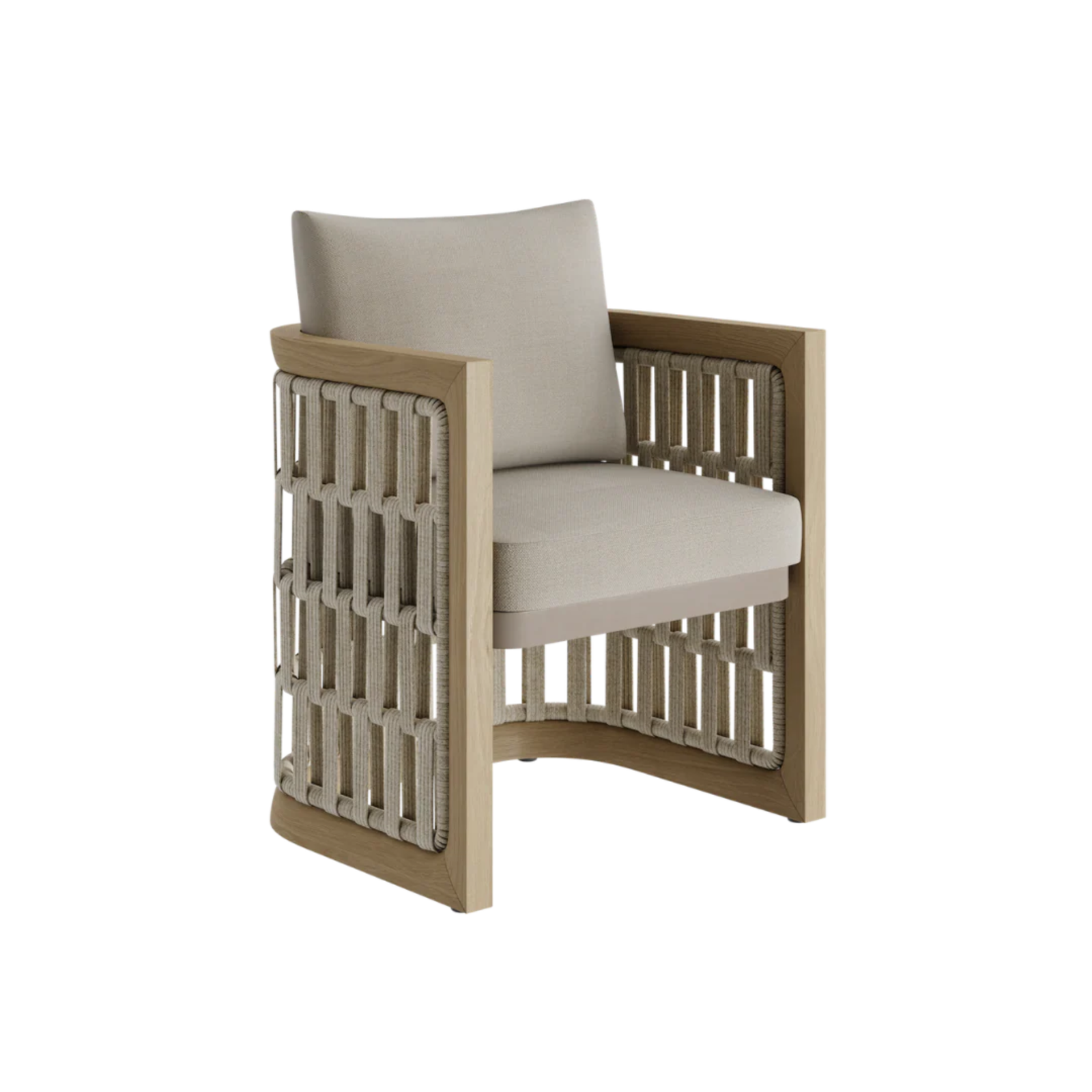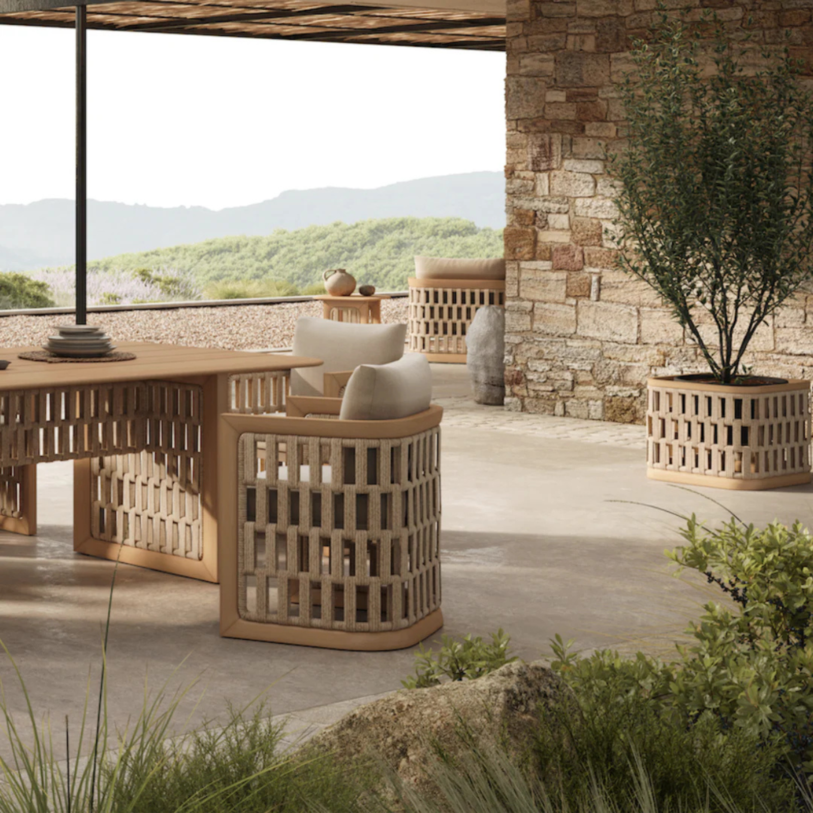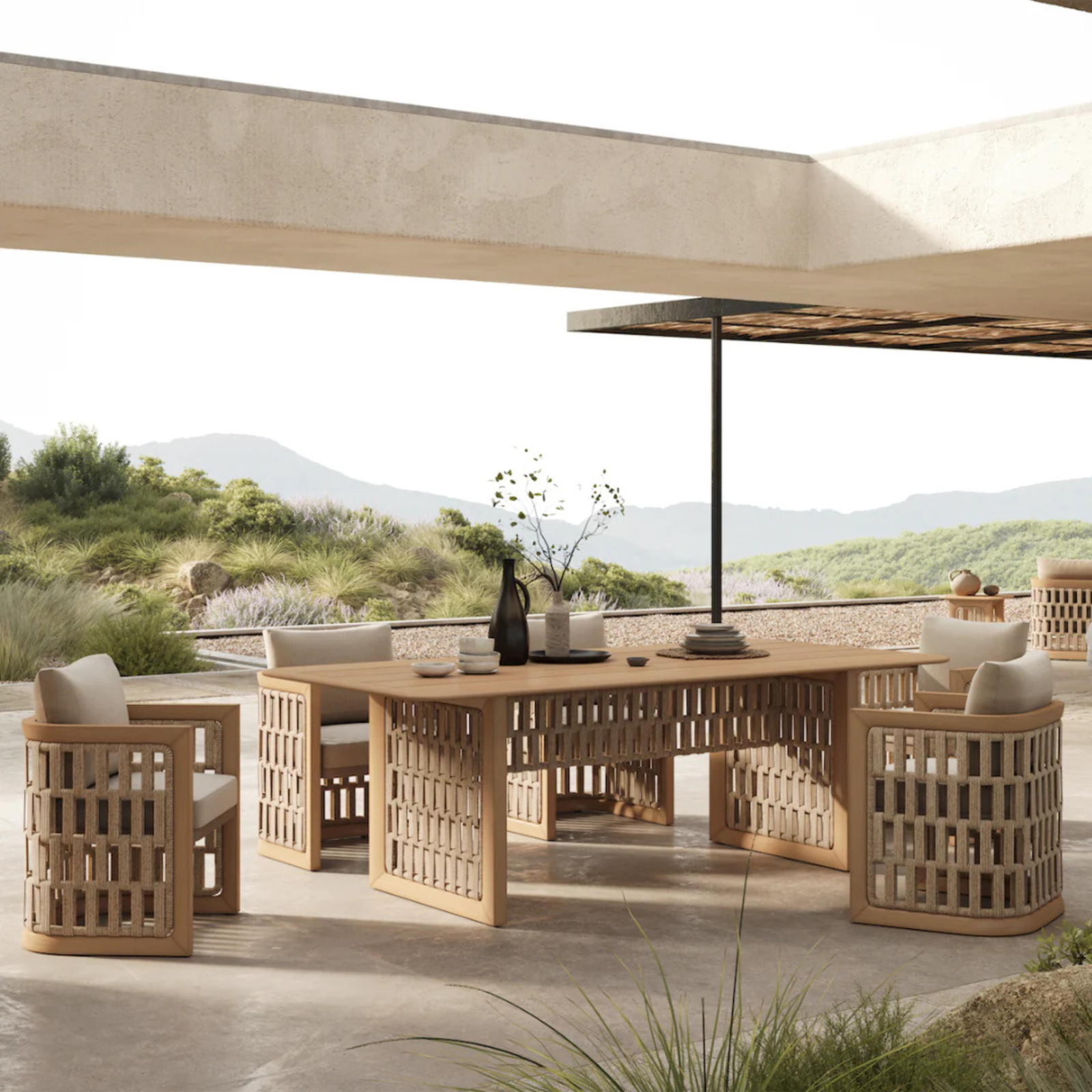 Inspired by Boho-style aesthetics, the set blends natural materials with clean, contemporary lines. Crafted from solid teak wood and accented with hand-braided rope detailing, the dining chairs are upholstered in premium outdoor fabric by Najib Selim, offering exceptional durability, comfort, and timeless elegance—perfectly suited for outdoor living in Egypt’s climate.