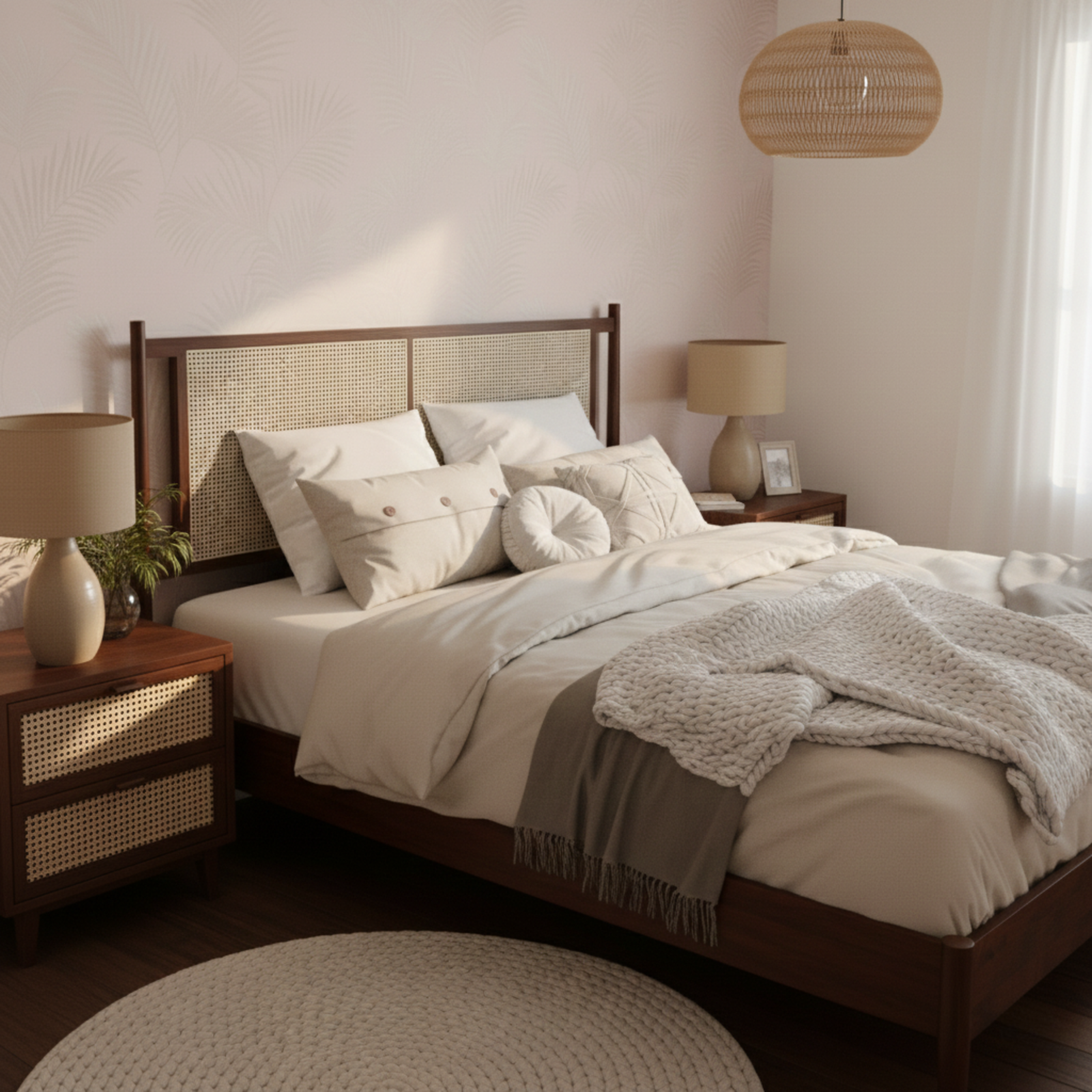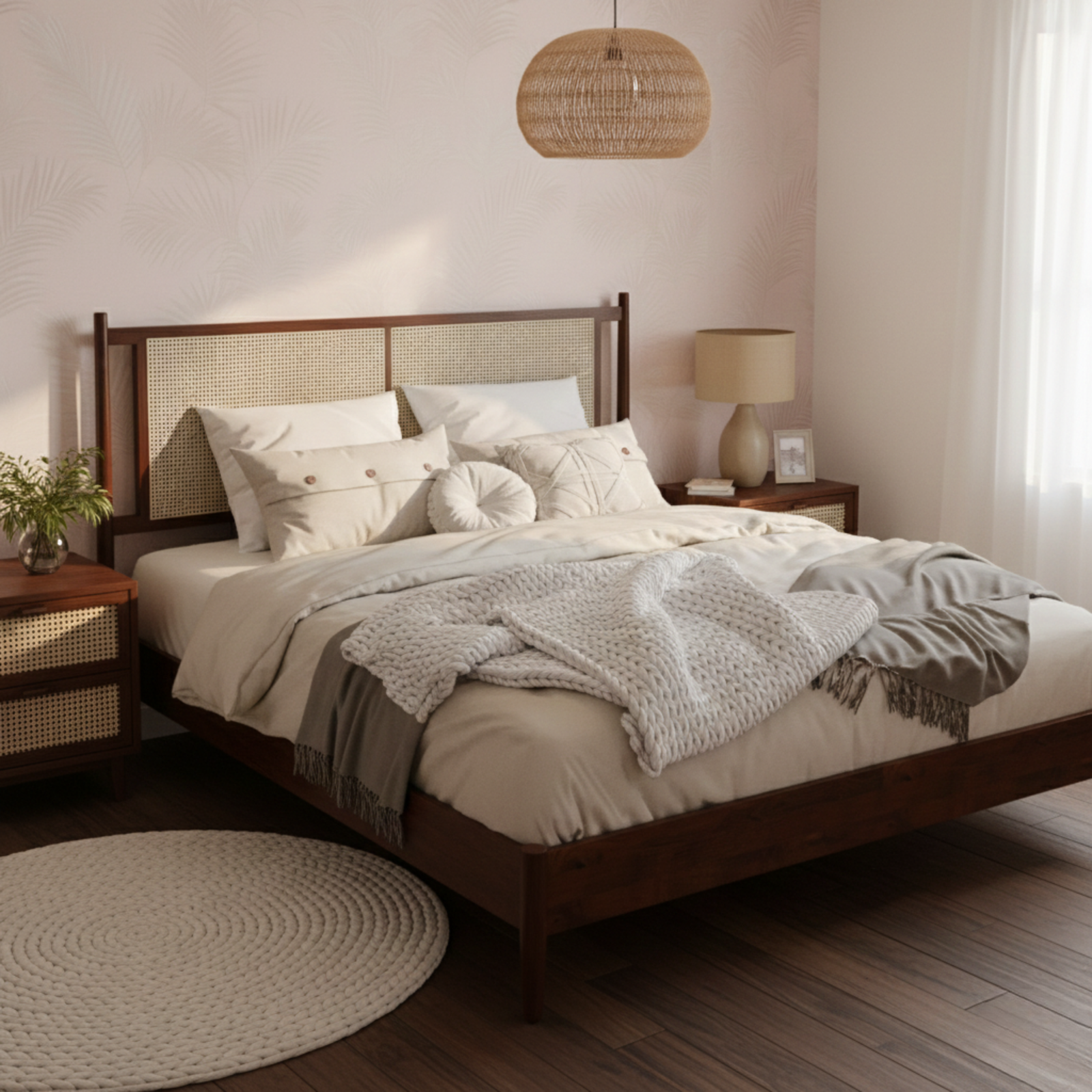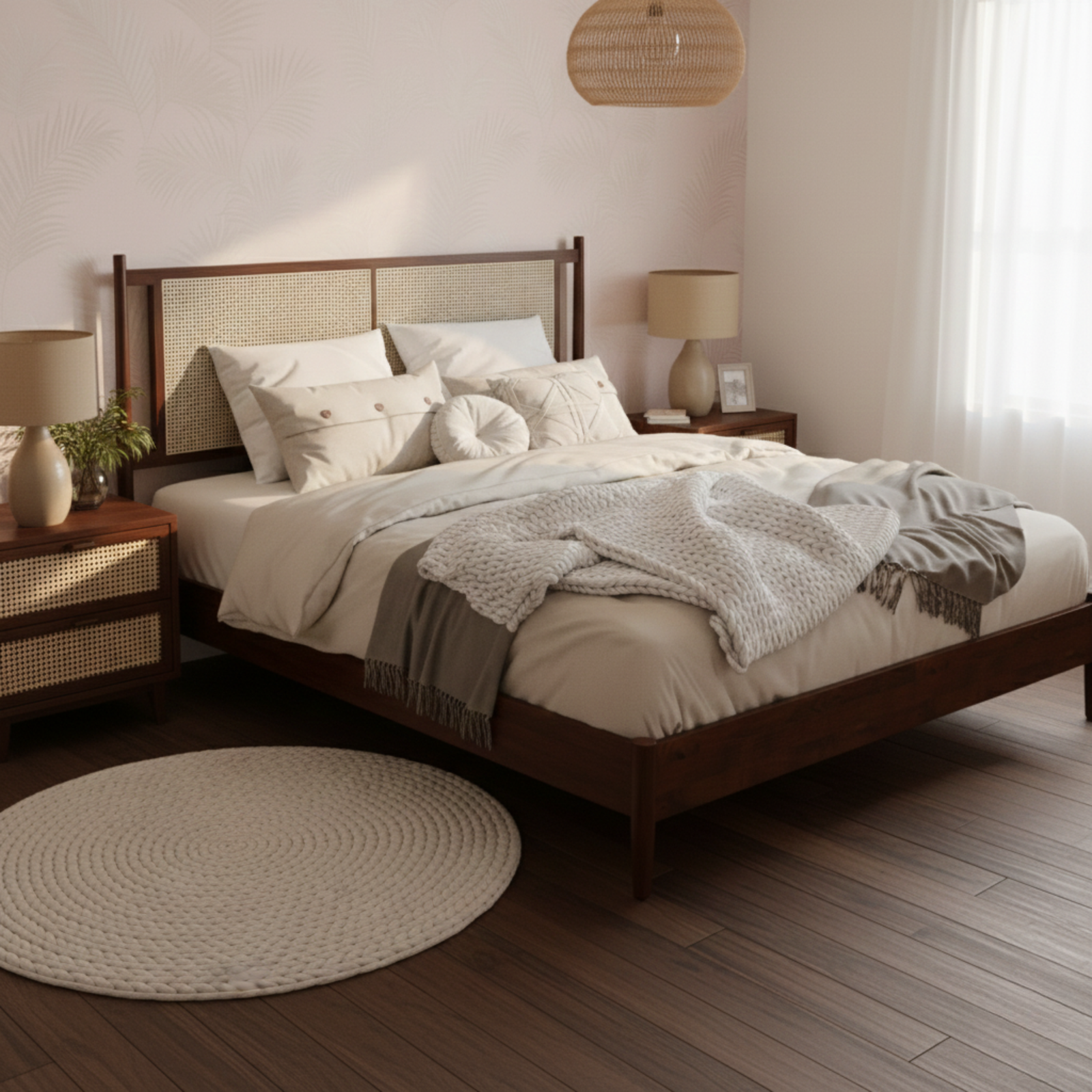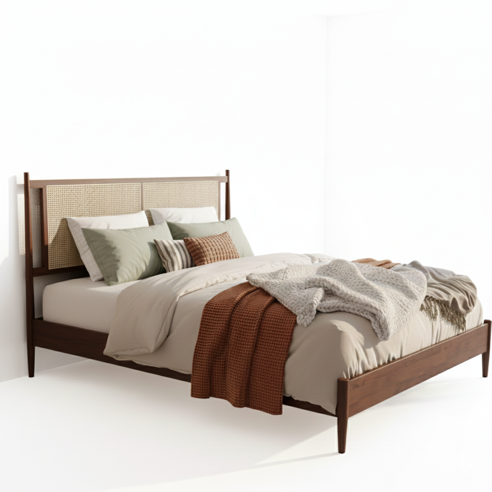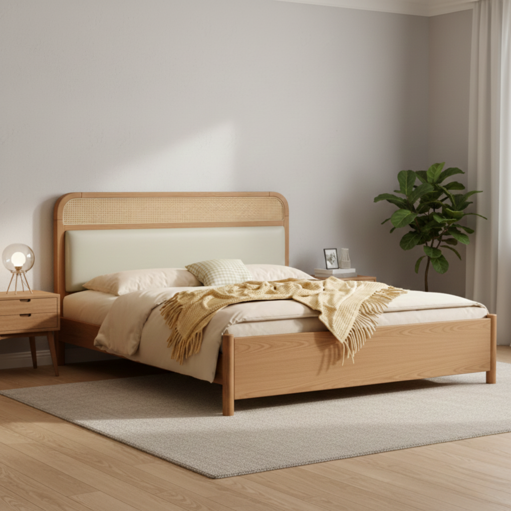 ZAHRA Bed is a refined Boho cane bed crafted from solid beech wood, designed to bring natural luxury, warmth, and timeless elegance to modern bedrooms. Featuring a handwoven cane headboard, it blends organic texture with a clean, minimalist silhouette inspired by classic Ottoman refinement.